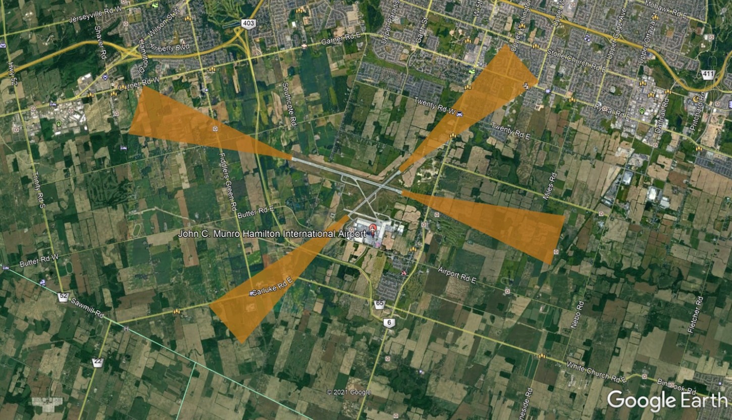 Hamilton International does not control flight paths to and from the Airport, yet we work closely with NAV CANADA and airlines to understand how to best minimize the noise impact without compromising the safety of air traffic. Flight paths for approach and take-off on Hamilton’s main Runway (12-30) are designed to avoid major communities. Hamilton International is unable to change these flight paths.