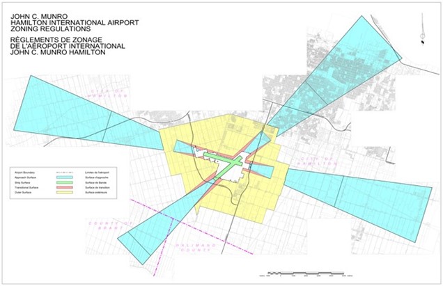 Assessments for noise exposure are performed in accordance with Transport Canada’s standard for “Land Use in the Vicinity of Airports” (TP-1247E). The Urban Hamilton Official Plan also identifies the development types that are acceptable based on Aircraft Noise Exposure Forecast (NEF) contours around the Hamilton International Airport and a City of Hamilton By-Law No. 05-196 exists to minimize future conflicts between the operation of the Airport and surrounding land uses.